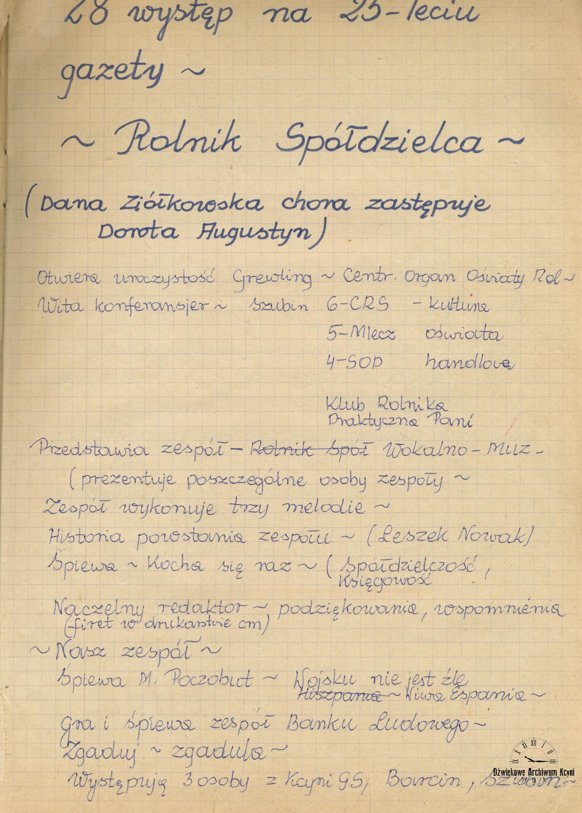 Pierwotnie wycinek z tej gazety został zamieszczony w kronice kółka recytatorskiego, które funkcjonowało w latach 70. w szkole podstawowej nr 1 w Kcyni. Kółko recytatorskie prowadziła nauczycielka języka polskiego pani Kazimiera Pezacka. Jak czytamy w kronice (zobacz jej fragment poniżej), członkowie koła uświetnili swoim udziałem spółdzielczą uroczystość.