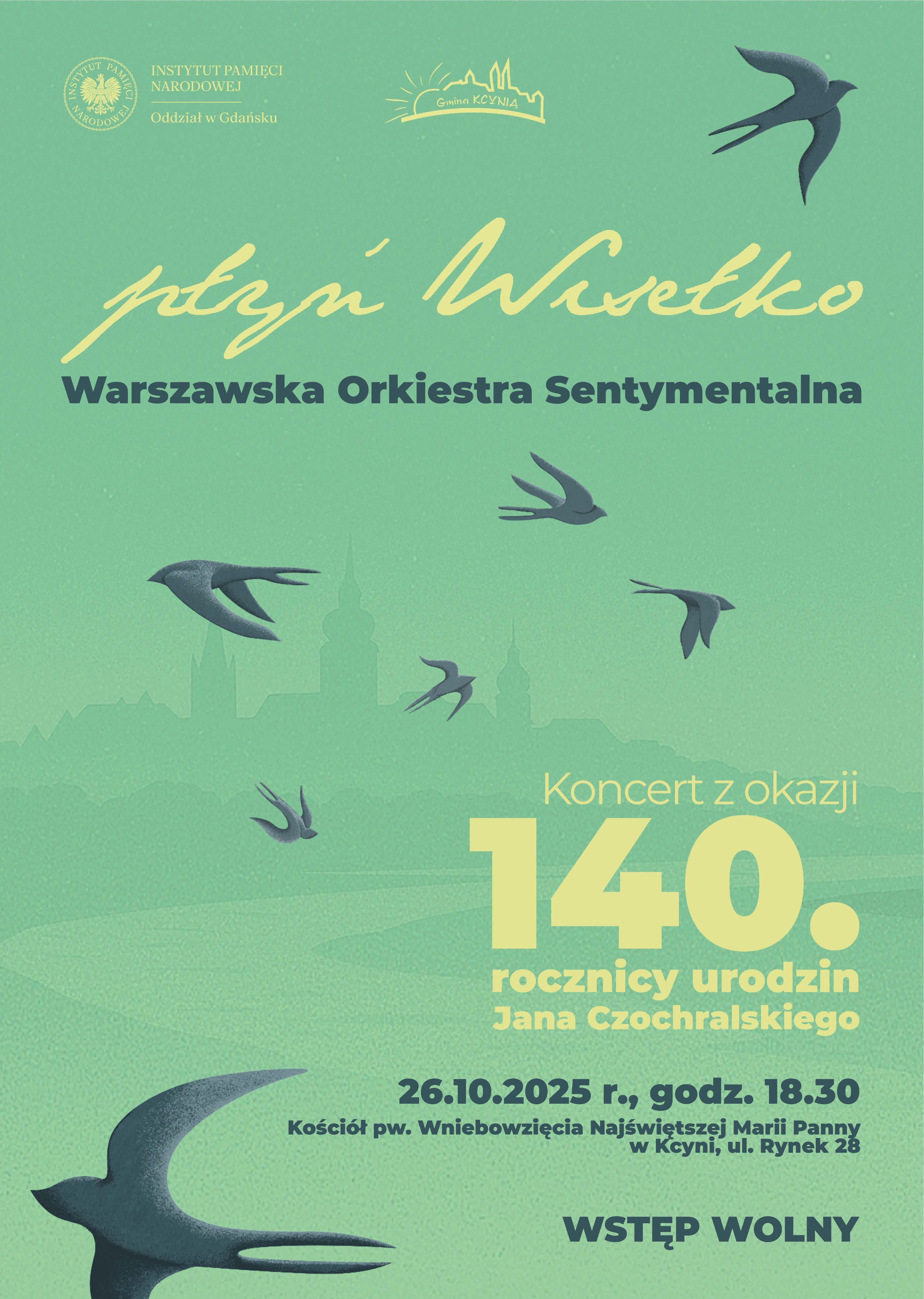 Burmistrz Kcyni Mateusz Stachowiak oraz Dyrektor Oddziału IPN w Gdańsku dr Marek Szymaniak zapraszają na koncert Warszawskiej Orkiestry Sentymentalnej, który odbędzie się w niedzielę, 26 października o godz. 18.30 w kościele pw. WNMP w Kcyni. Koncert organizowany jest na okoliczność 140. rocznicy urodzin Jana Czochralskiego. Zapraszamy serdecznie! Wstęp wolny!