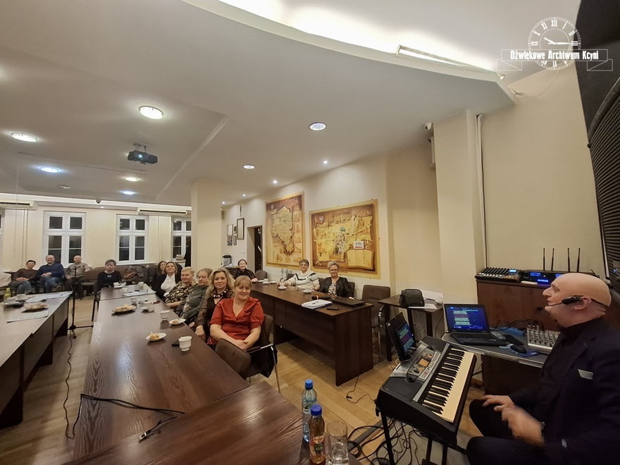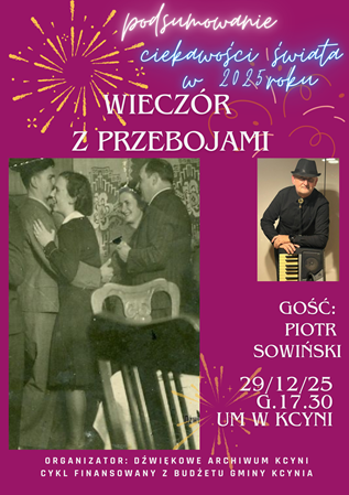 Ostatnie w tym roku spotkanie z cyklu "Ciekawość świata" odbyło się w poniedziałek, 29 grudnia 2025 r. W towarzystwie Piotra Sowińskiego - muzyka, aranżera, frontmana zespołu Ancymony podsumowaliśmy kończący się rok. Witając naszego Gościa podkreśliłam, że Piotr Sowiński kilkukrotnie gościł w Kcyni, wzbogacając muzycznie wydarzenia organizowane przez Dźwiękowe Archiwum. Były to potańcówki w stylu retro (w roku 2019 oraz w 2022) oraz wspólne kolędowanie, które odbyło się w 2020 roku. Tym milej było się spotkać po raz kolejny. Okazało się, że osób, które wspólnie chcą pośpiewać jest wiele - na nasze muzyczne podsmuowanie roku licznie przybyła publiczność z Kcyni i okolic. Nasz Gość przygotował prezentację ze słowami przebojów, tak, by ułatwić nam wspólne śpiewanie. Zabrzmiały między innymi takie utwory jak: Odpływają kawiarenki, Remedium, Windą do nieba, Konik na biegunach, Czarny Alibaba.