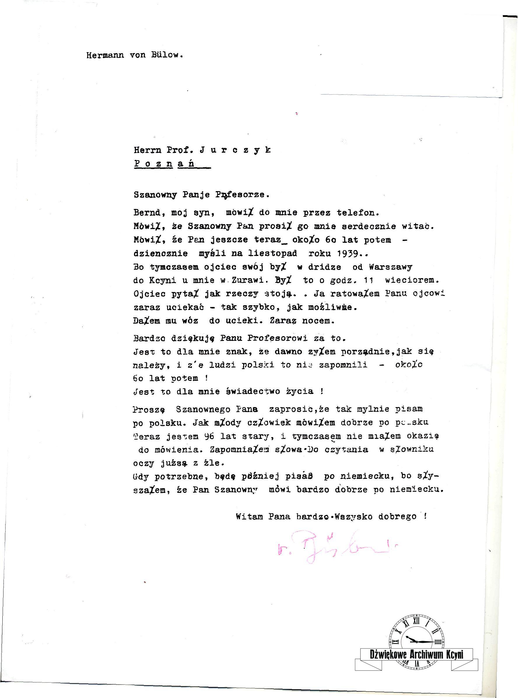 Pan prof. Witold Jurczyk nadesłał nam kopię listu, jaki otrzymał od Hermanna von Bülow w 2001 roku, potwierdzającego informację o tym, że Herman von Bülow ostrzegł Emila Jurczyka, pomógł mu w ucieczce i tym samym przyczynił się do uratowania mu życia. Emil Jurczyk znał dobrze rodzinę von Bülow, gdyż przed wojną, gdy dzieci były kształcone w systemie domowym, przez guwernantkę, do jego obowiązków należało weryfikowanie poziomu kształcenia dzieci i przeprowadzanie raz do roku egzaminu sprawdzającego ich wiedzę.