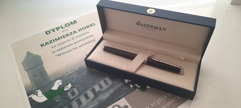 Laureat II miejsca pan Kazimierz Horka otrzymuje pióro wieczne Waterman Hemisphere oraz notes Dźwiękowego Archiwum Kcyni, w którym jak ufam zostaną zapisane nowe utwory...