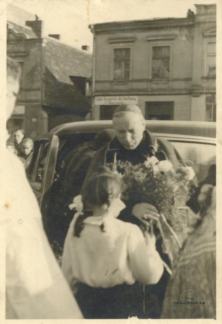 Poniżej zdjęcie przedstawiające powitanie prymasa Wyszyńskiego w Kcyni. Pochodzi z archiwum Ewy Palickiej. Niestety nie wiemy dokładnie, w którym roku to zdjęcie zostało wykonane. Wiemy natomiast, że prymas Wyszyński przyjeżdżał do Kcyni również w 1957 r.