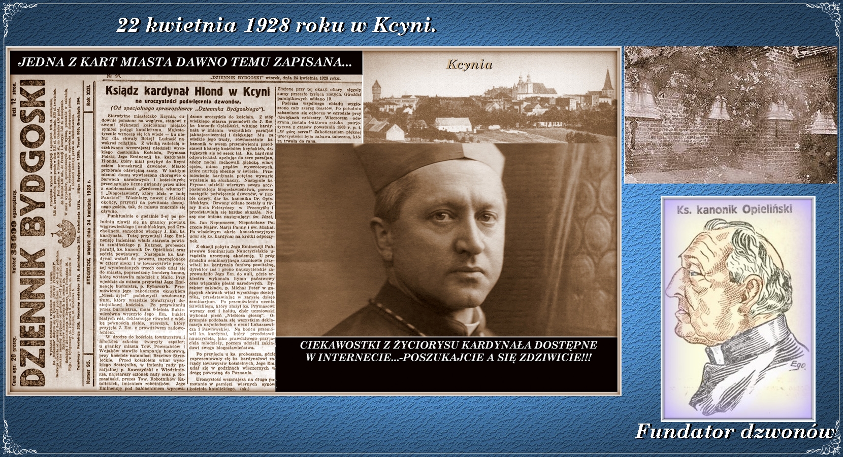 Warto w tym miejscu wspomnieć, że Kcynię odwiedzali także inni prymasi: w 1928 roku poświęcenia dzwonów przy kościele farnym dokonał Jego Eminencja prymas ks. kardynał August Hlond (informację nadesłał Roman Tadych).