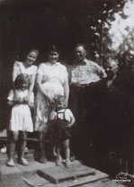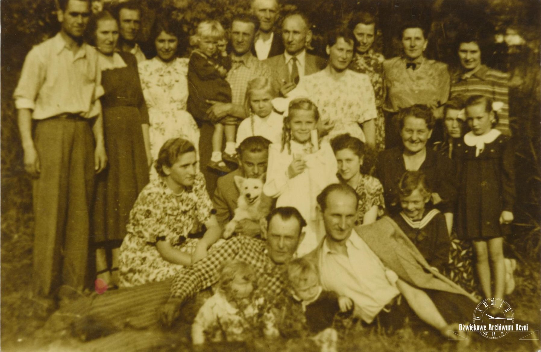 W przysiadzie od lewej: 1. Irena Kromrych, z domu Szpotańska - żona dyrektora szkoły w Królikowie Dominika Kromrycha, córka Cecylii i Antoniego Szpotańskich, 2. Marian Kowalski (z psem), syn Jana Kowalskiego i Stanisławy z domu Szpotańskiej, 3. Irena Mendel córka Pawła Lewandowskiego i Teresy z domu Szpotańskiej (moja chrzestna), 4. Maria Nowak z Kcyni (ciocia Misia), siostra Alojzego Nowaka, znanego kcynianina, 5. Łucja Szpotańska, druga żona Antoniego Szpotańskiego z córką Haliną, 6. Dziewczynka w marynarskim kołnierzyku Maryla Woźniak, obecnie Krzyżanowska, mieszka w Kcyni, 7. leżący z lewej Jan Kowalski, mąż Stanisławy Szpotańskiej, 8. leżący z prawej Paweł Lalasz, mąż Wandy Lalasz z domu Olszewskiej, córki Katarzyny Olszewskiej z domu Szpotańskiej, 9,10 Dzieci siedzących z przodu nie rozpoznaję. Być może jest tam Danuta Lalasz.