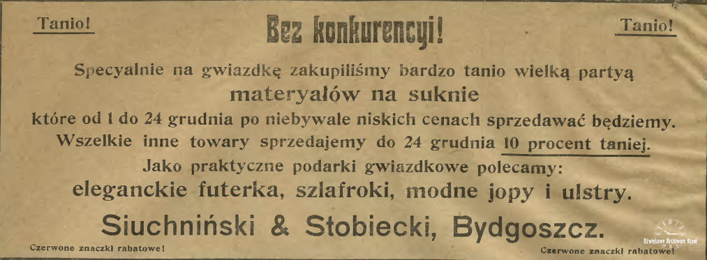 Specyalnie na gwiazdkę zakupiliśmy bardzo tanio wielką partyą materyałów na suknie - informuje dom towarowy Siuchniński & Stobiecki w Bydgoszczy w opłaconej przez siebie reklamie w Dzienniku Bydgoskim z 19 grudnia 1909 r. (źródło: Kujawsko-Pomorska Biblioteka Cyfrowa, www.kpbc.umk.pl, dostęp z dnia 18.12.2020)