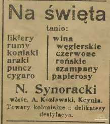 Jednym z nich był skład kolonialny Antoniego Kozłowskiego, następnie prowadzony przez Józefa Kozłowskiego. Działał przy Rynku i oferował na święta tanio: likiery rumy koniaki (...) wina węgierskie czerwone (...) towary kolonialne * delikatesy* destylacya (źródło: Kujawsko-Pomorska Biblioteka Cyfrowa, www.kpbc.umk.pl, dostęp z dnia 18.12.2020)