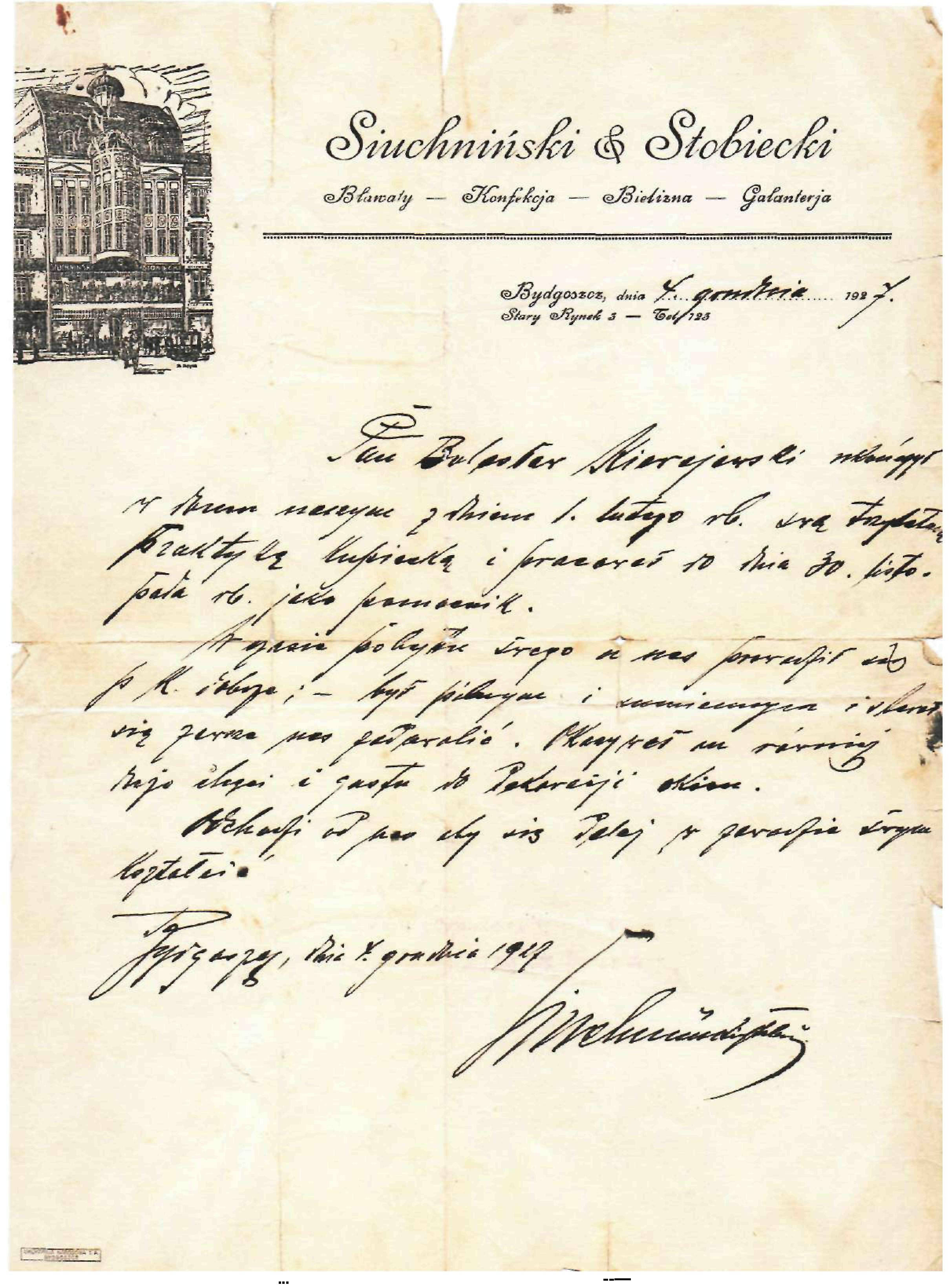 Warto w tym miejscu uzupełnić, że dom handlowy Siuchniński & Stobiecki mieścił się w Bydgoszczy przy Starym Rynku, w eleganckiej wielopiętrowej, secesyjnej kamienicy. Kupcy bydgoscy Mieczysław Siuchniński i Roman Stobiecki założyli firmę w 1902 r. i jak często bywa w przypadku takich spółek, zaczynali od małego sklepu włókienniczego przy Nowym Rynku. Firma rozwijała się i kupcy nabyli w 1911 r. barokową kamienicę przy Starym Rynku, którą następnie rozebrali i w 1912 r. wybudowali piękną, okazałą kamienicę, według projektu Otto Mullera (informacje na podstawie: www.polskaniezwykla.pl - dostęp z dnia 23.12.2020). Dom handlowy był pierwszym, który wprowadził obsługę w języku polskim. Zainteresowanych historią firmy odsyłam do strony (kliknij). W firmie handlowej Siuchniński & Stobiecki swoje praktyki odbywał Bolesław Kierejewski z Kcyni, który kształcił się na kupca. Dźwiękowe Archiwum Kcyni dysponuje opinią o praktykancie, sporządzoną na papierze firmowym, udostępnioną przez córkę p. Bolesława, Marię Mańkowską.