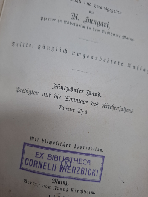 Funkcję proboszcza parafii pw. św. Stanisława Biskupa i Męczennika w Buku obejmuje w październiku 1939 r. Na miejsce zmarłego w sierpniu 1939 r. ks. proboszcza Stanisława Kuliszaka osieroconą parafię bukowską obejmuje w dniu 1.10.1939 r.2 Próbuje funkcjonować w wojennej rzeczywistości. Na pewno pomaga mu wykształcenie i znajomość języka niemieckiego. W rodzinnym archiwum przetrwały niektóre publikacje z biblioteki Kornela Wierzbickiego, opatrzone jego łacińskim ex librisem: EX BIBLIOTECA CORNELLI WIERZBICKI. Czy dał go sobie wykonać jeszcze podczas studiów w Rzymie? Nad stroną tytułową dopisek ołówkiem: Kornel Wierzbicki 20. Co oznacza liczba umieszczona pod nazwiskiem? wiek/numer w księdze studentów?/rok zakupu książki? Jak możemy przeczytać na stronie tytułowej (kliknij w miniaturę poniżej, aby powiększyć), książka zawiera Wzorcowe kazania katolickich ambon z czasów nowszych i najnowszych. Wybrane i opublikowane przez ks. Hungari, proboszcza Modelheim w diecezji mogunckiej, Mainz 1882.